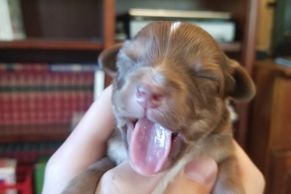 2 weeks old. Red merle male. White patch on head. Dark liver patches. Smallest in litter.